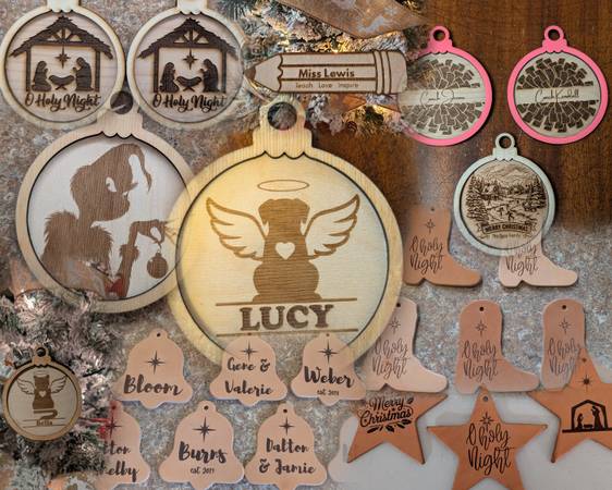 Common ornament die cut shapes that we engrave on for leather are Bells, Boots, Stars, Christmas Tree, Crosses ( styles), moose outline and coasters. The leather "ornaments" have so many other possibilities other than Christmas!