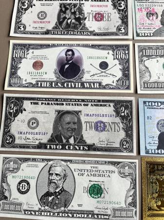 For Sale: Ten different assorted novelty (non-negotiable) banknotes. Almost all are rare or out of print. All in mint condition. You will notice that one of the notes is 24K gold foil.