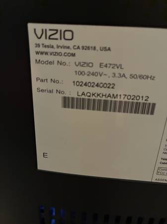 The VIZIO E472VL is a 47-inch LCD HDTV with multiple inputs and a 120Hz refresh rate. It operates on 100-240V, 3.3A, 50/60Hz power.