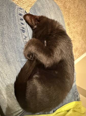 Rehoming small black male (not neutered) cat. Litter trained and has been around other cats and dogs. No shots or vet visits. Very playful and has a good prey drive. Small rehoming fee of $20.00.